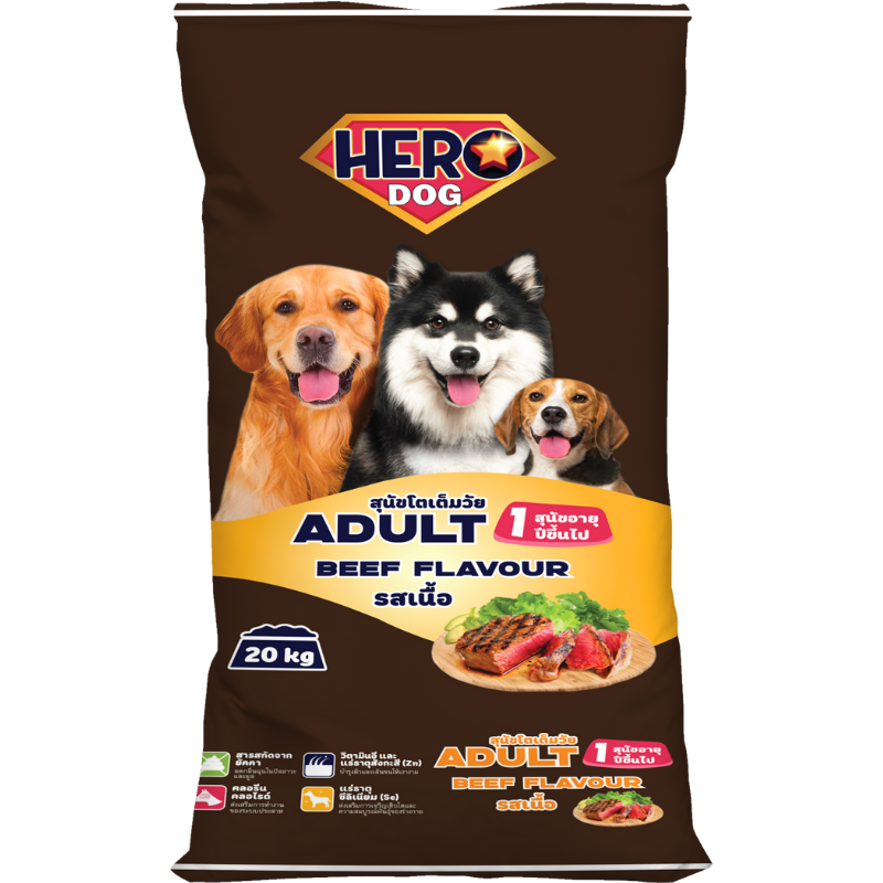 Với công thức cân đối giữa đạm, chất béo, vitamin và khoáng chất, Hero Dog Beef Flavour không chỉ cung cấp năng lượng cho các hoạt động thường ngày mà còn góp phần duy trì sức khỏe lâu dài, giúp chú chó của bạn luôn khỏe mạnh, nhanh nhẹn và tràn đầy sức sống.