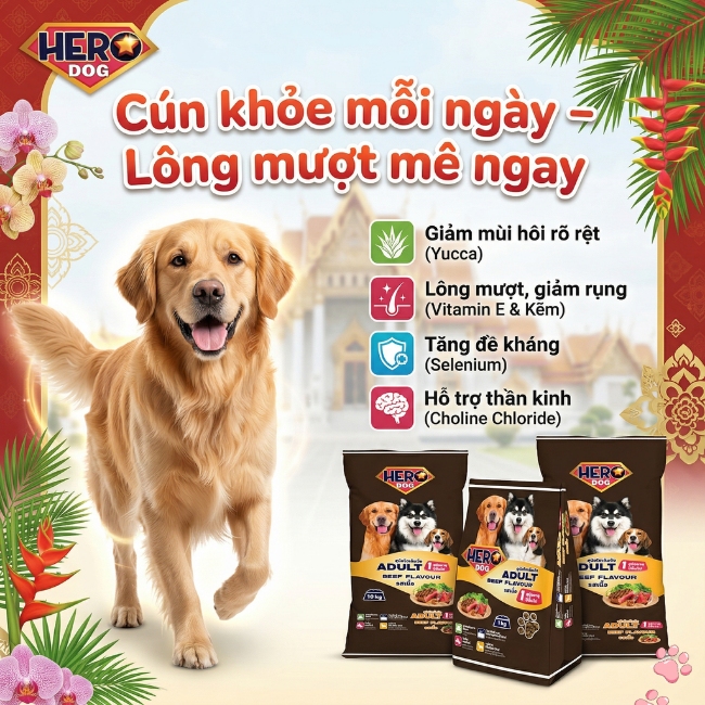 Với công thức cân đối giữa đạm, chất béo, vitamin và khoáng chất, Hero Dog Beef Flavour không chỉ cung cấp năng lượng cho các hoạt động thường ngày mà còn góp phần duy trì sức khỏe lâu dài, giúp chú chó của bạn luôn khỏe mạnh, nhanh nhẹn và tràn đầy sức sống.